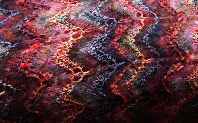 The picture below is a close-up of a Colinette Perugino throw. It was a fiddly but mesmerising project. I gave the finished object to my friend for a wedding present because I love to give finished items away. Some years later I made a second Perugino in forest greens. That was given to a friend as well. In my stash, I have a third Perugino kit, the result of which will be for me. It it is in pinks and pale greens and I hope all the mohair is still usable and has not welded itself into the shape of a goat or yak.